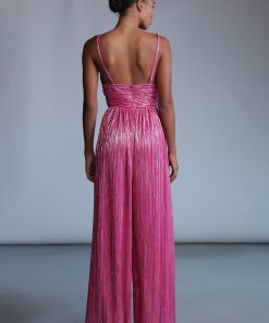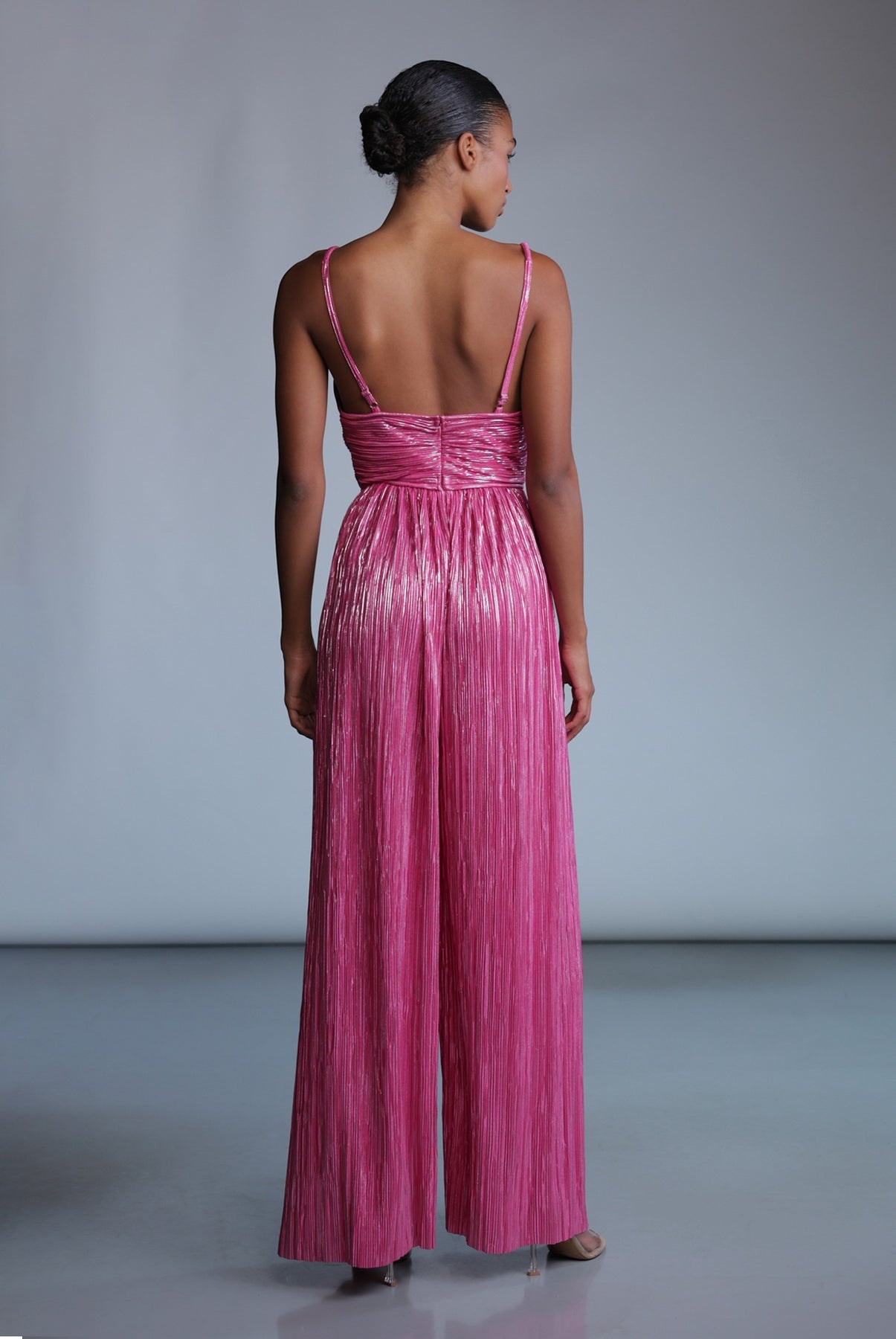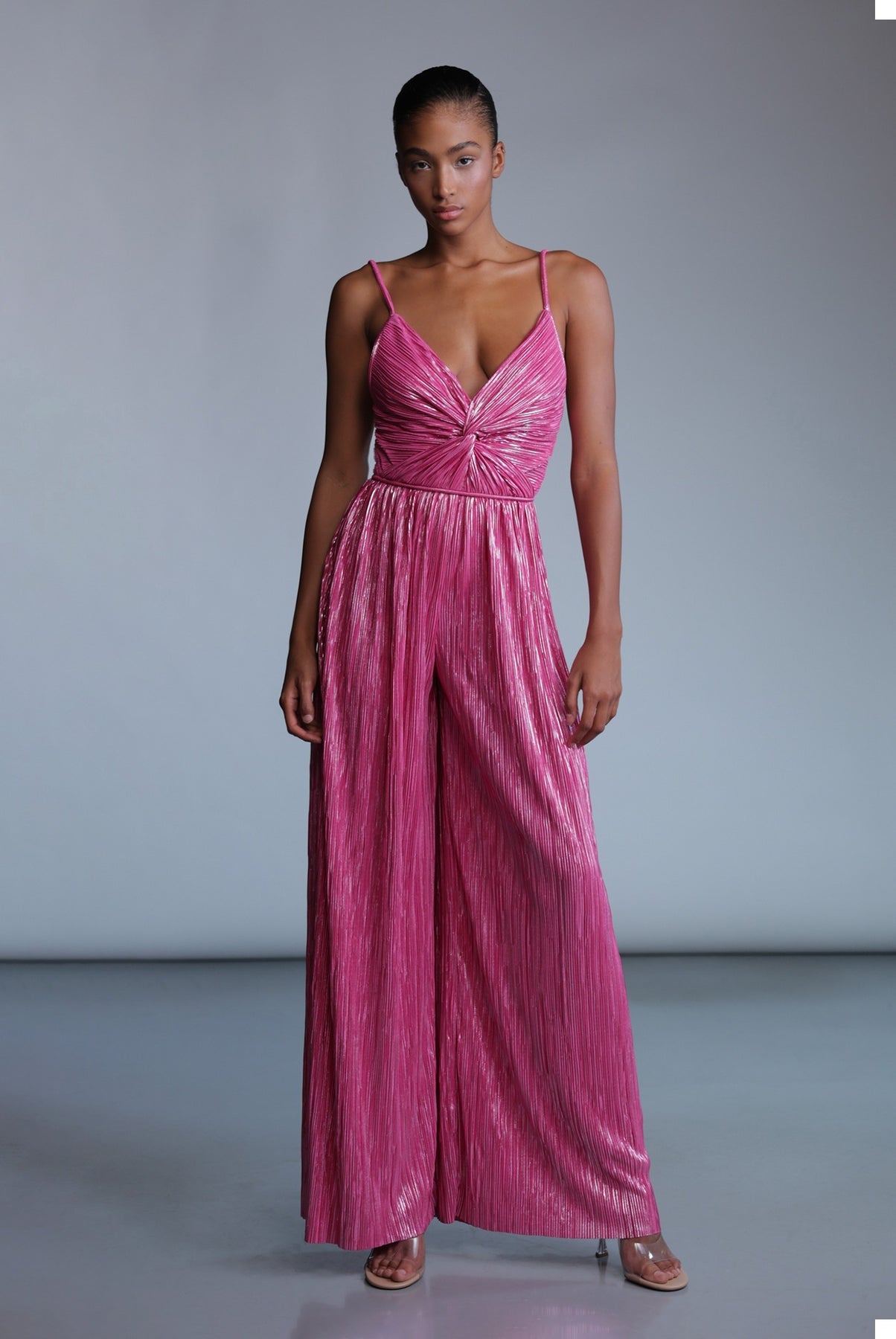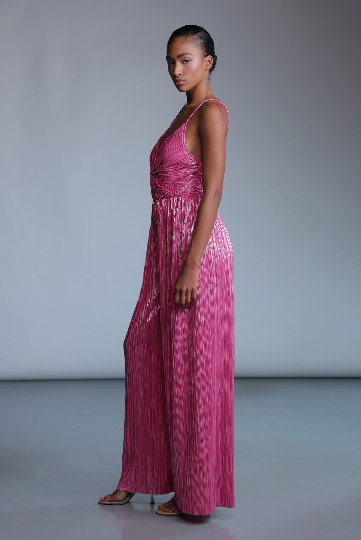 Pleated knit with foil wide leg jumpsuit with twist knot detail at front, thin adjustable straps, and invisible zipper at back.