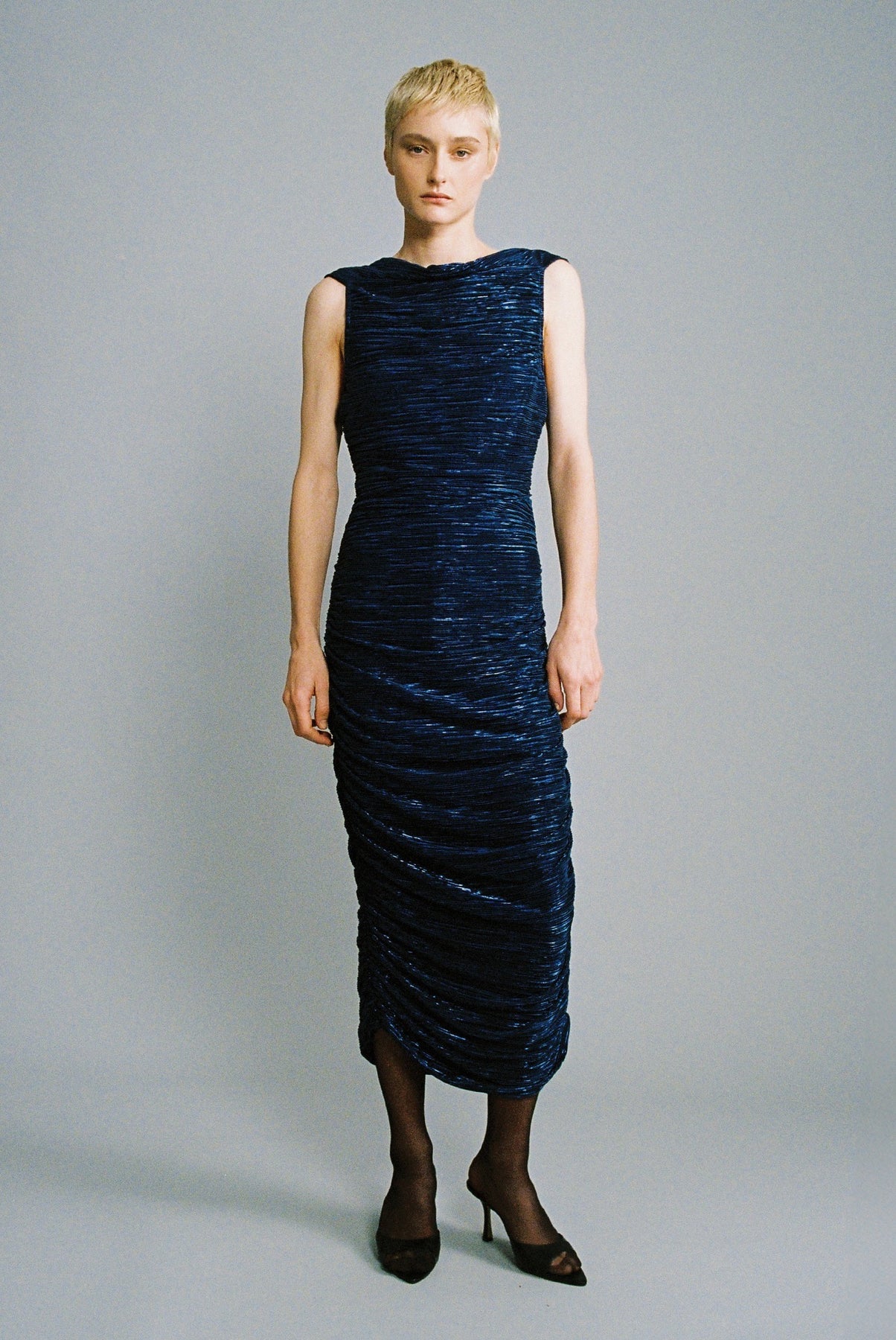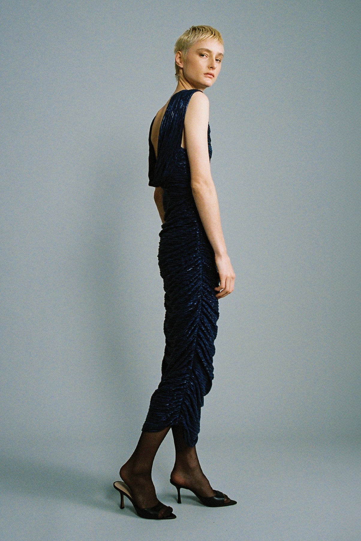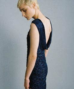 Pleated knit with foil midi dress featuring a deep opening at the back, and side draped detail.