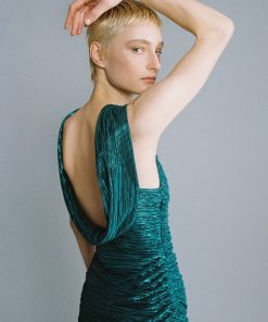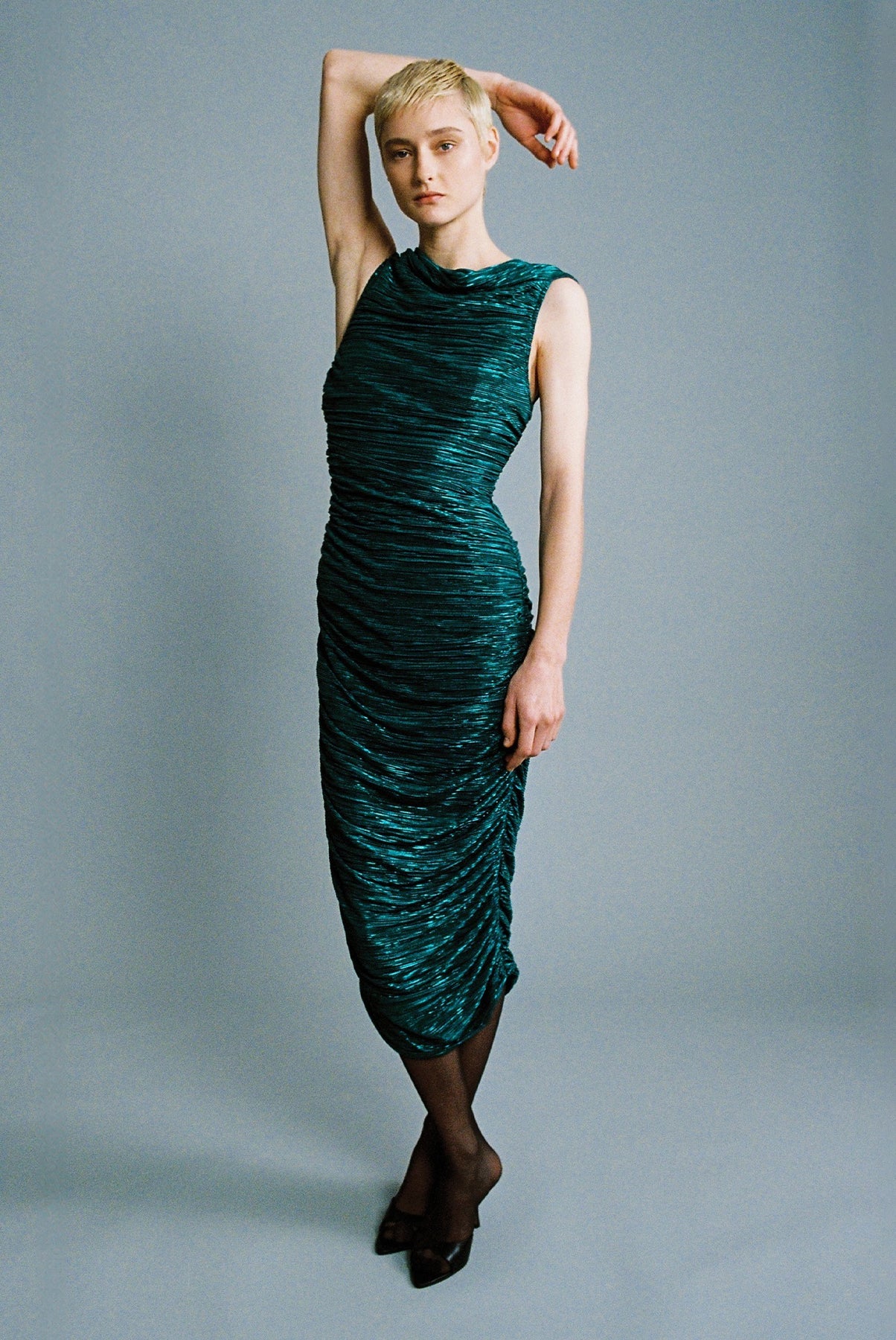 Pleated knit with foil midi dress featuring a deep opening at the back, and side draped detail.