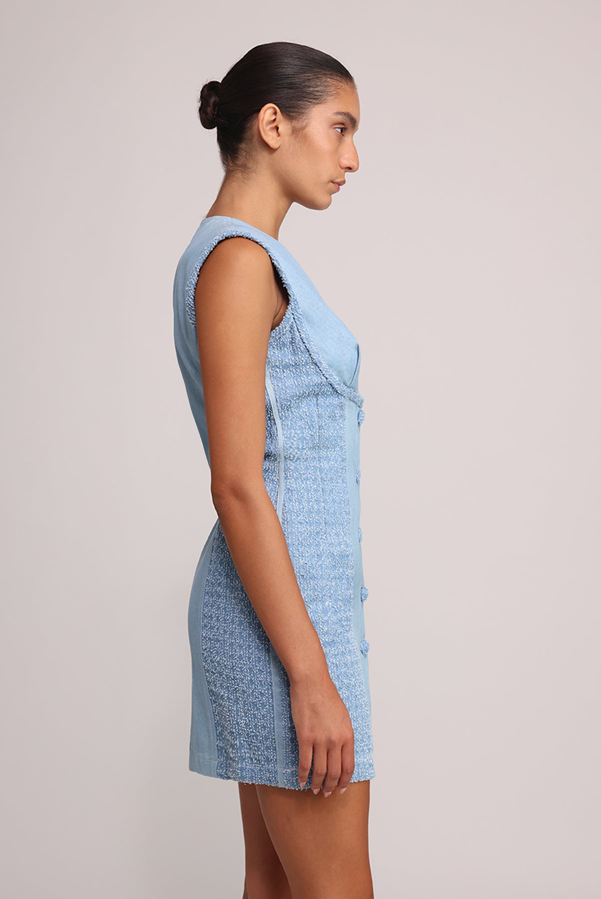- Casual denim mini dress with V – neckline by Sabina Musayev.