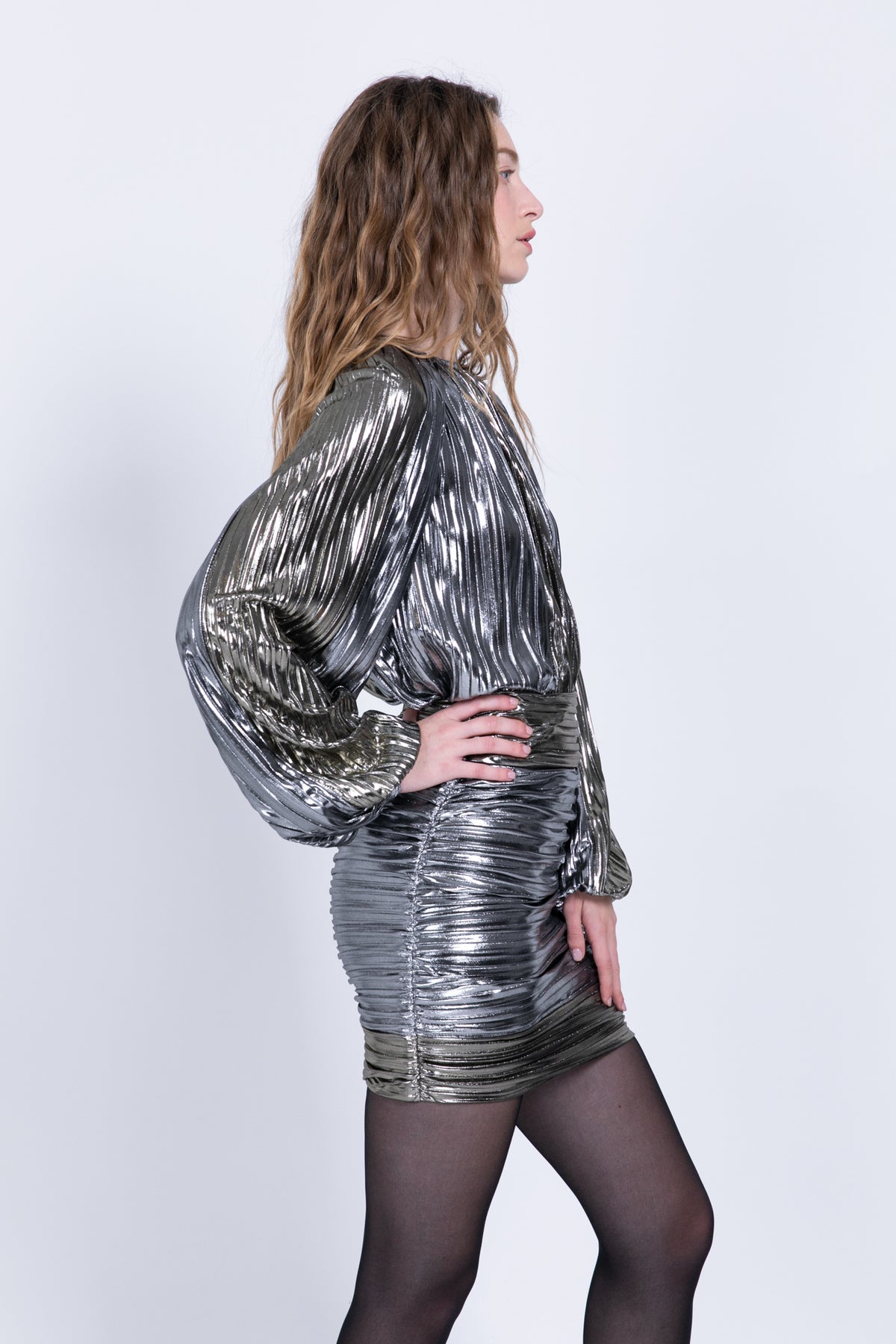 Two-tone pleated knit mini skirt with a high-waistedfitted skirt with gathering at sides, and invisible zipper atcenter back.