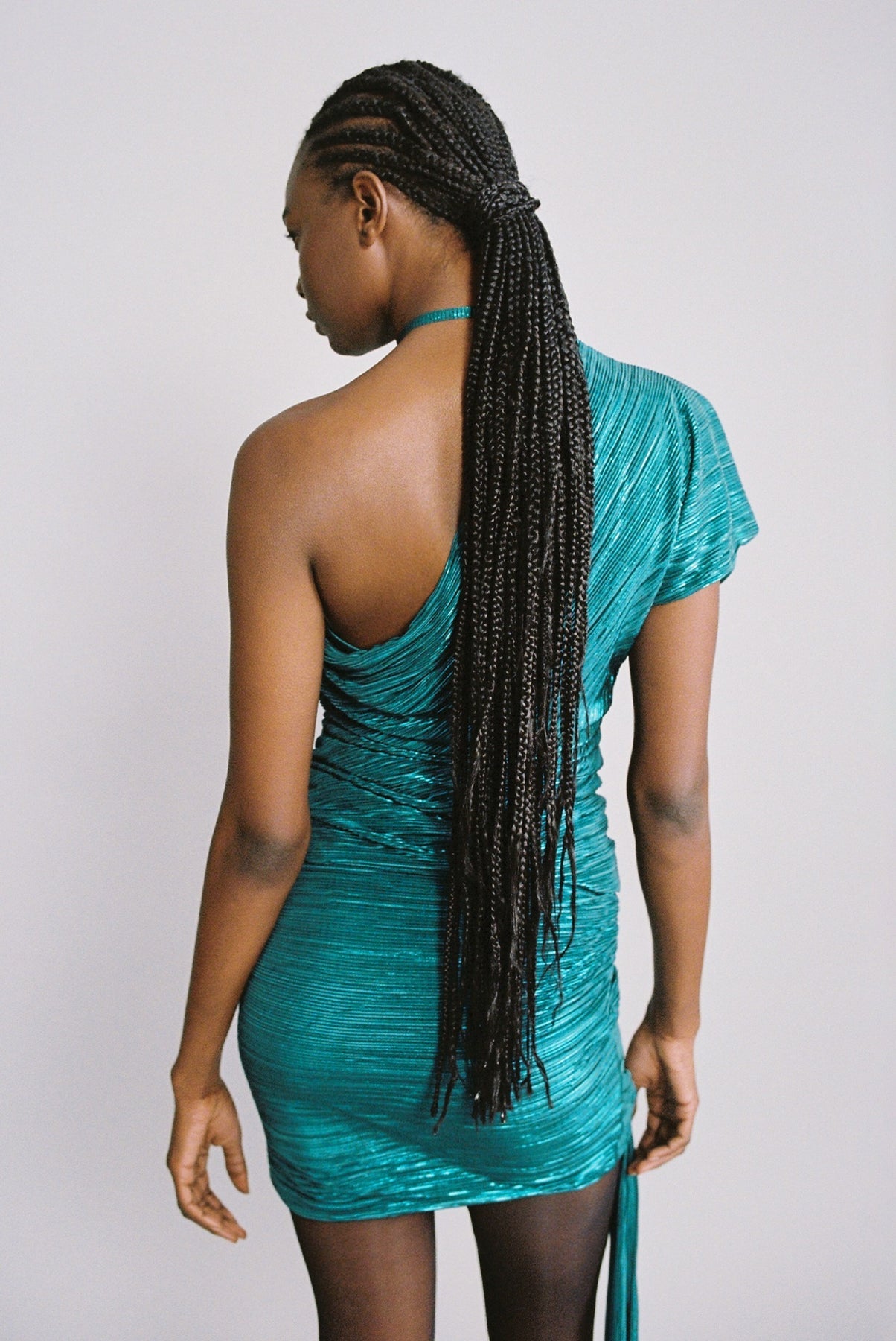 Pleated knit with foil mini skirt with gathering details.