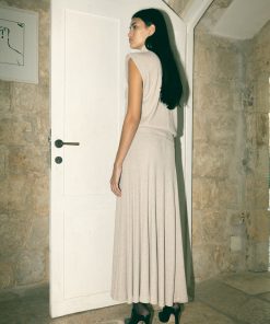 Lurex rib knit midi skirt with front slit, and multipleunique metallic buttons.