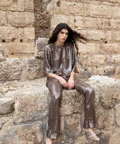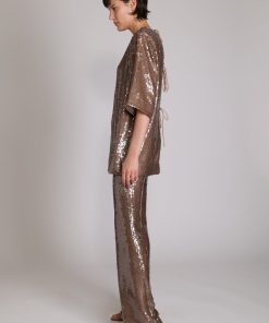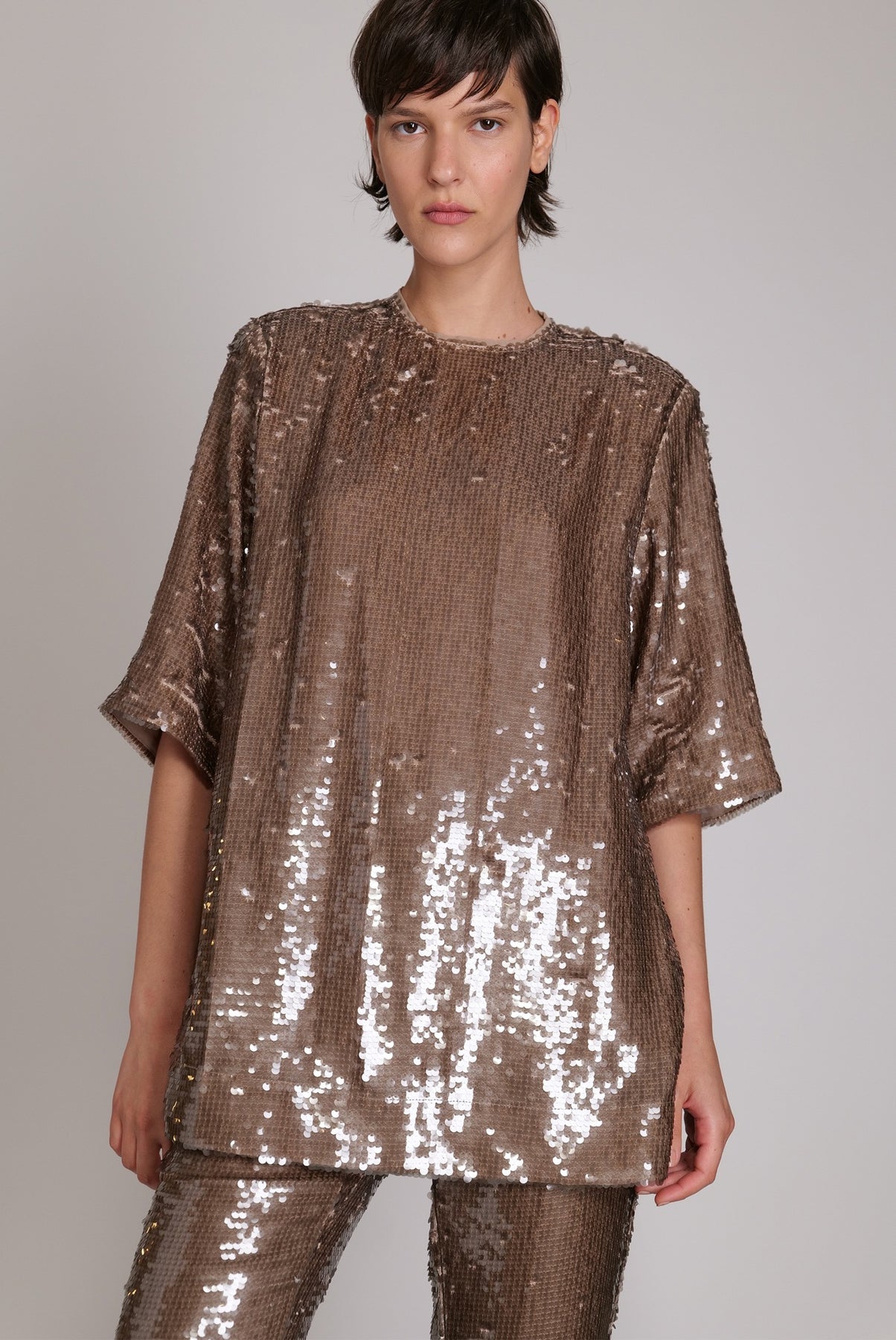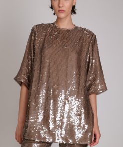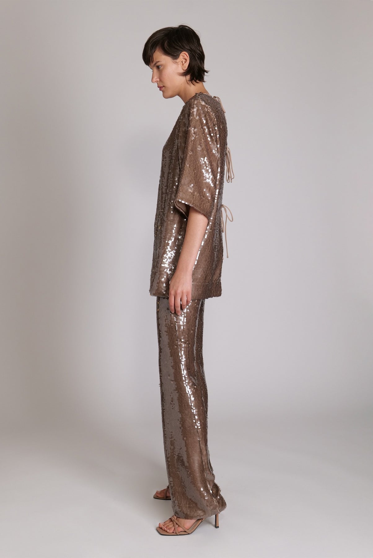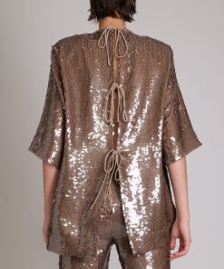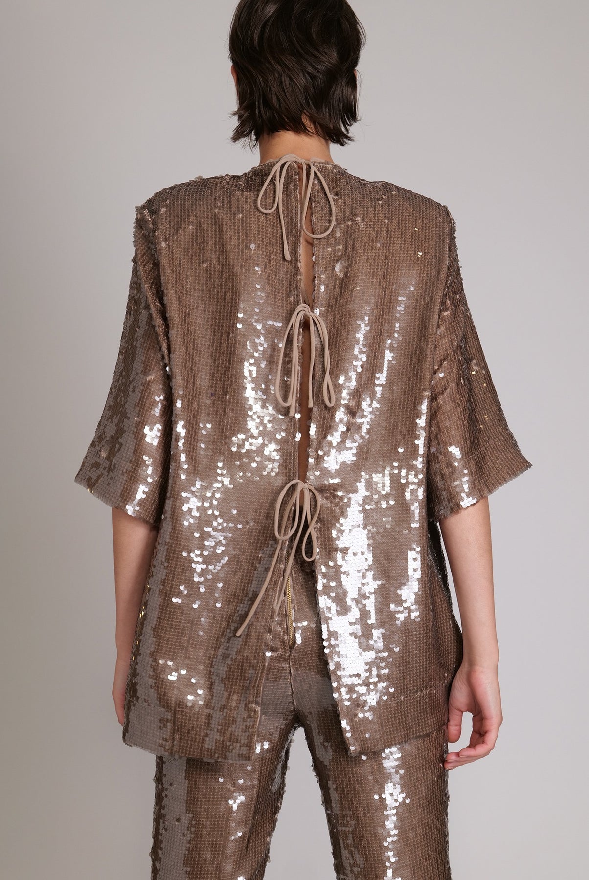 Loose-fitting sequin top featuring a round collar, short sleeves and open back with tie details.