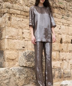 Loose-fitting sequin top featuring a round collar, short sleeves and open back with tie details.