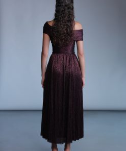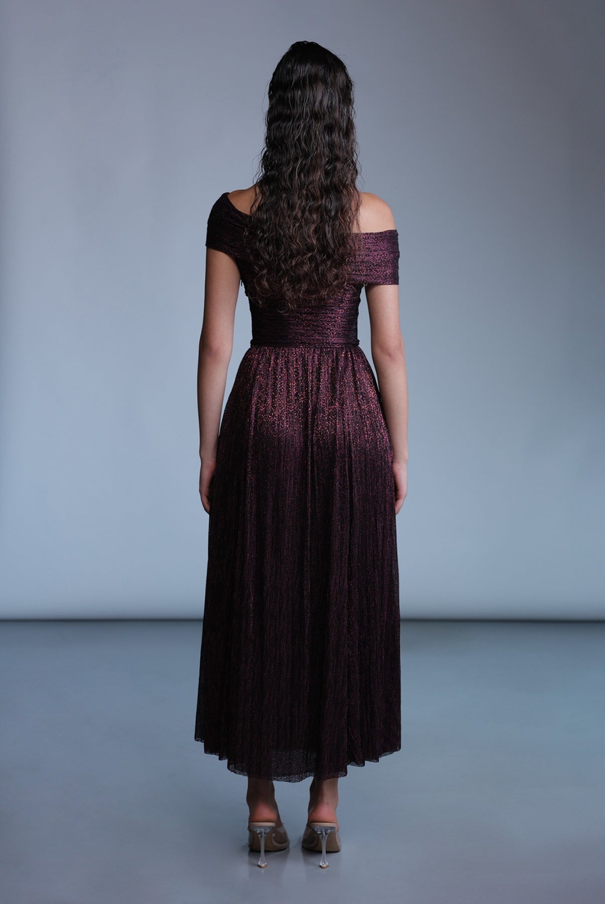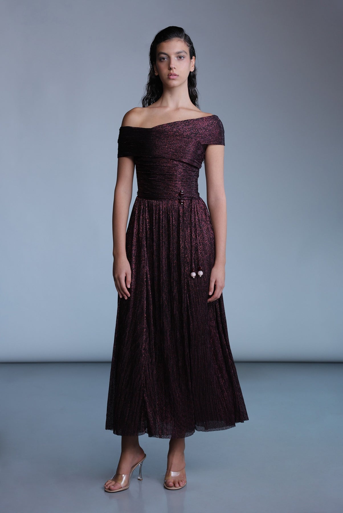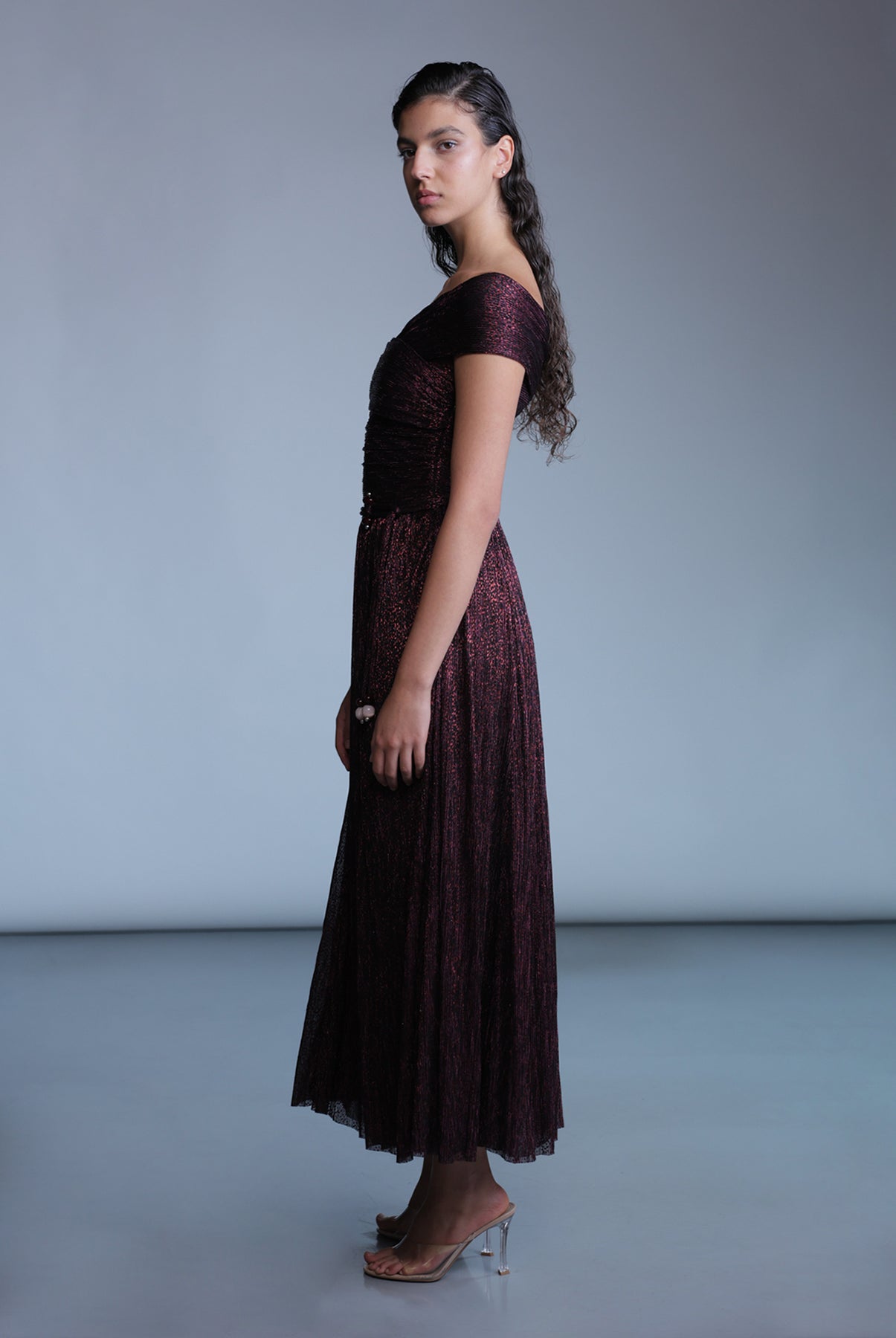 Ray lurex with foil off-the-shoulder maxi dress featuring twisted front detail, and invisible zipper at the side.