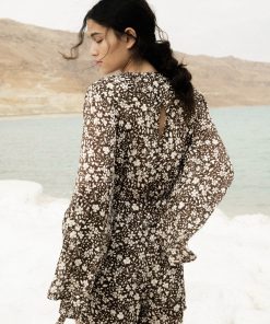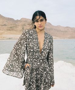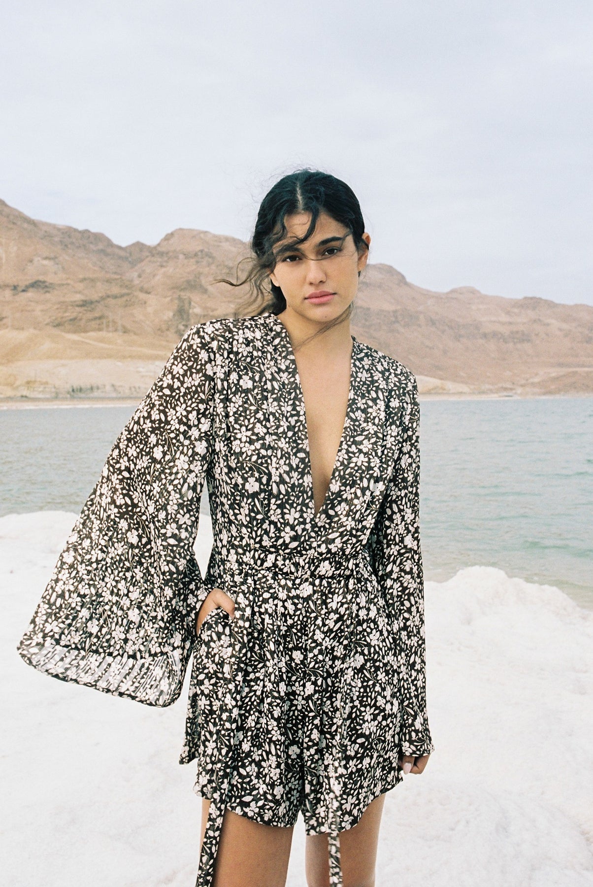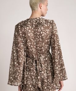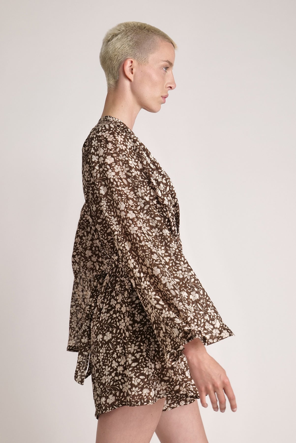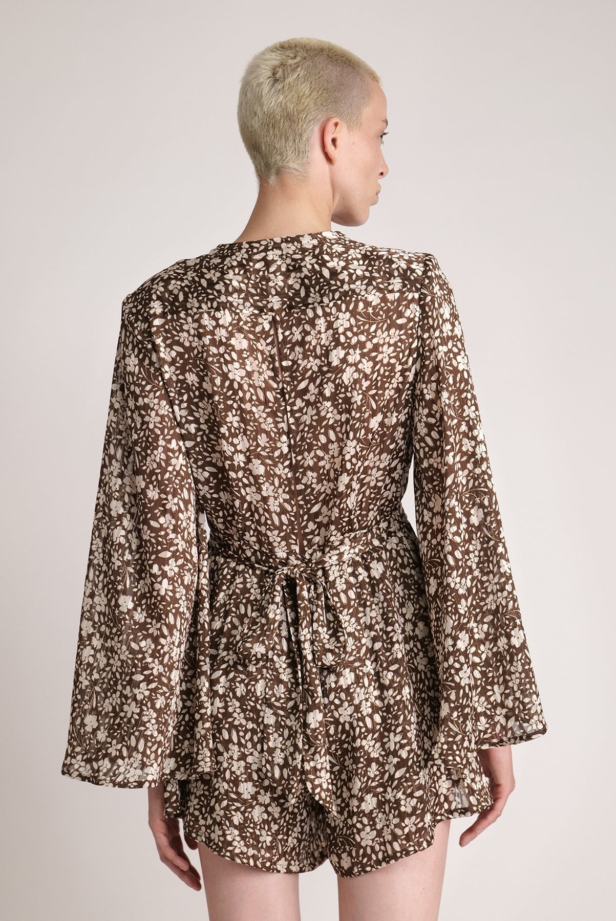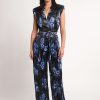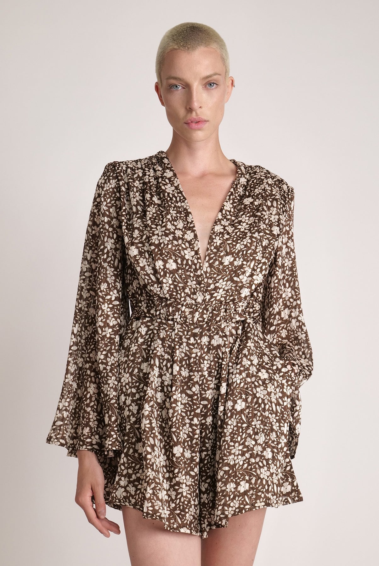 Floral chiffon with lurex V-neckline jumpsuit with expanding sleeves, rope belt, and side pockets.