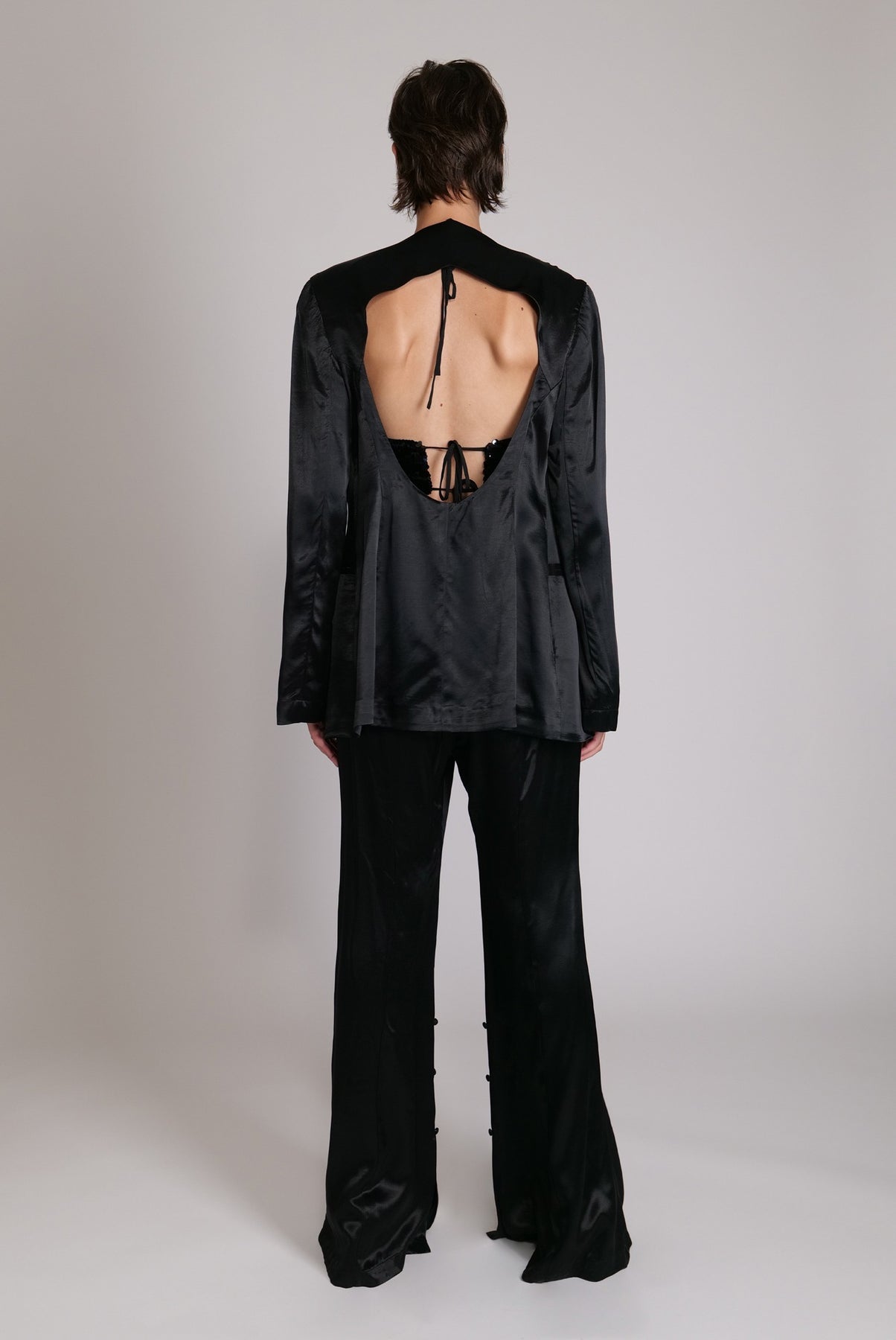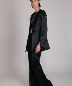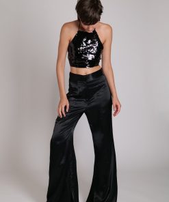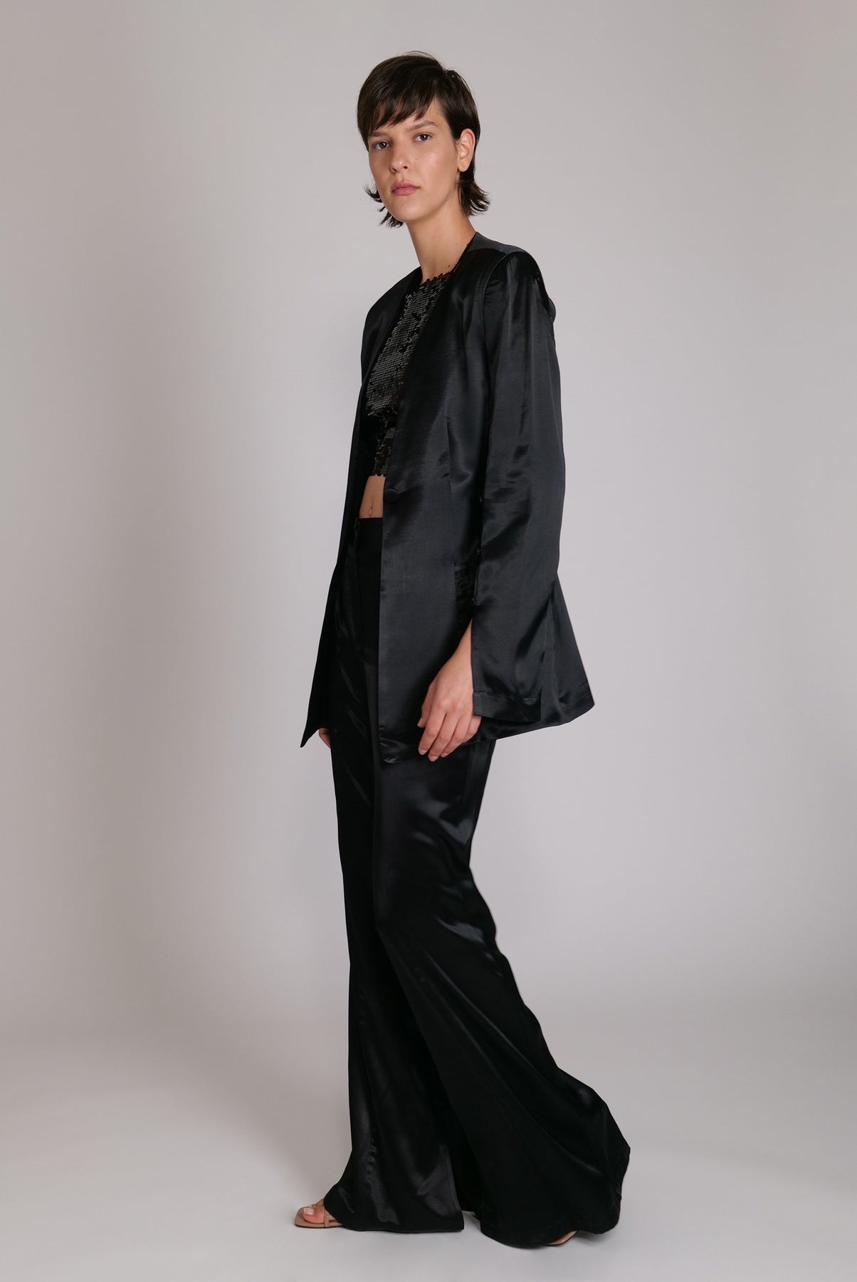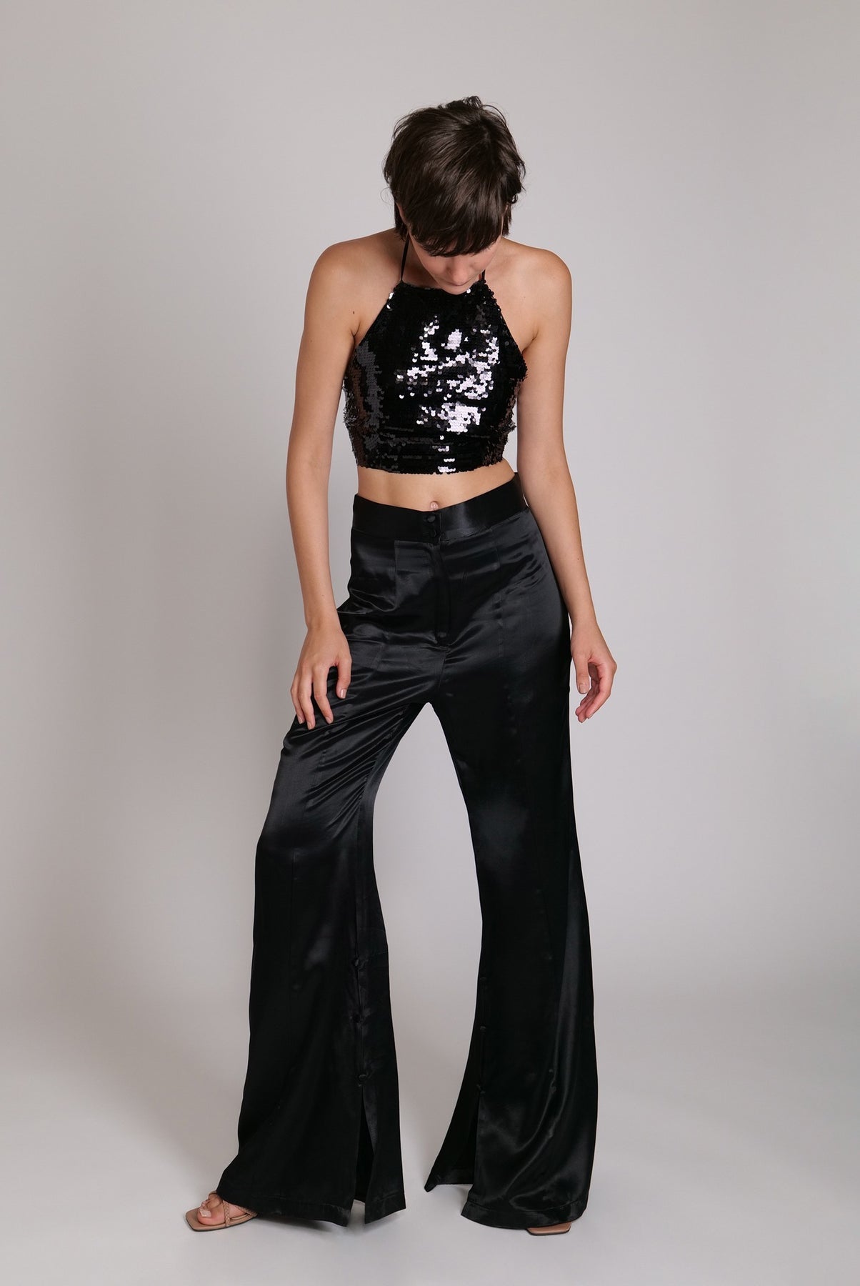 High-waist satin flared trousers with side vents and satin covered buttons, zip fly and matching covered button fastening.