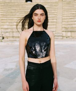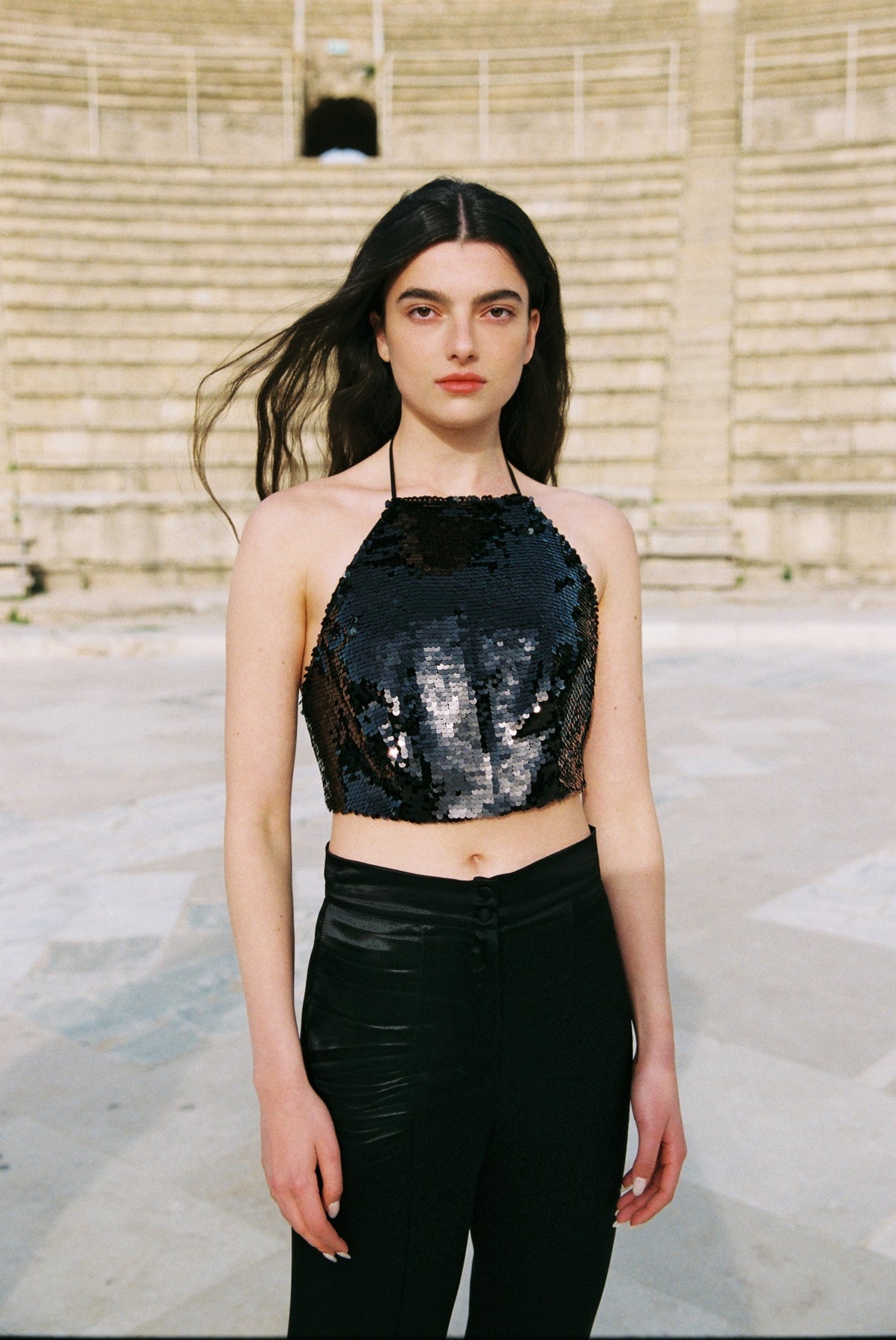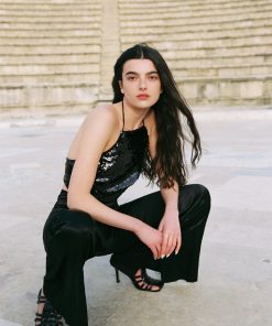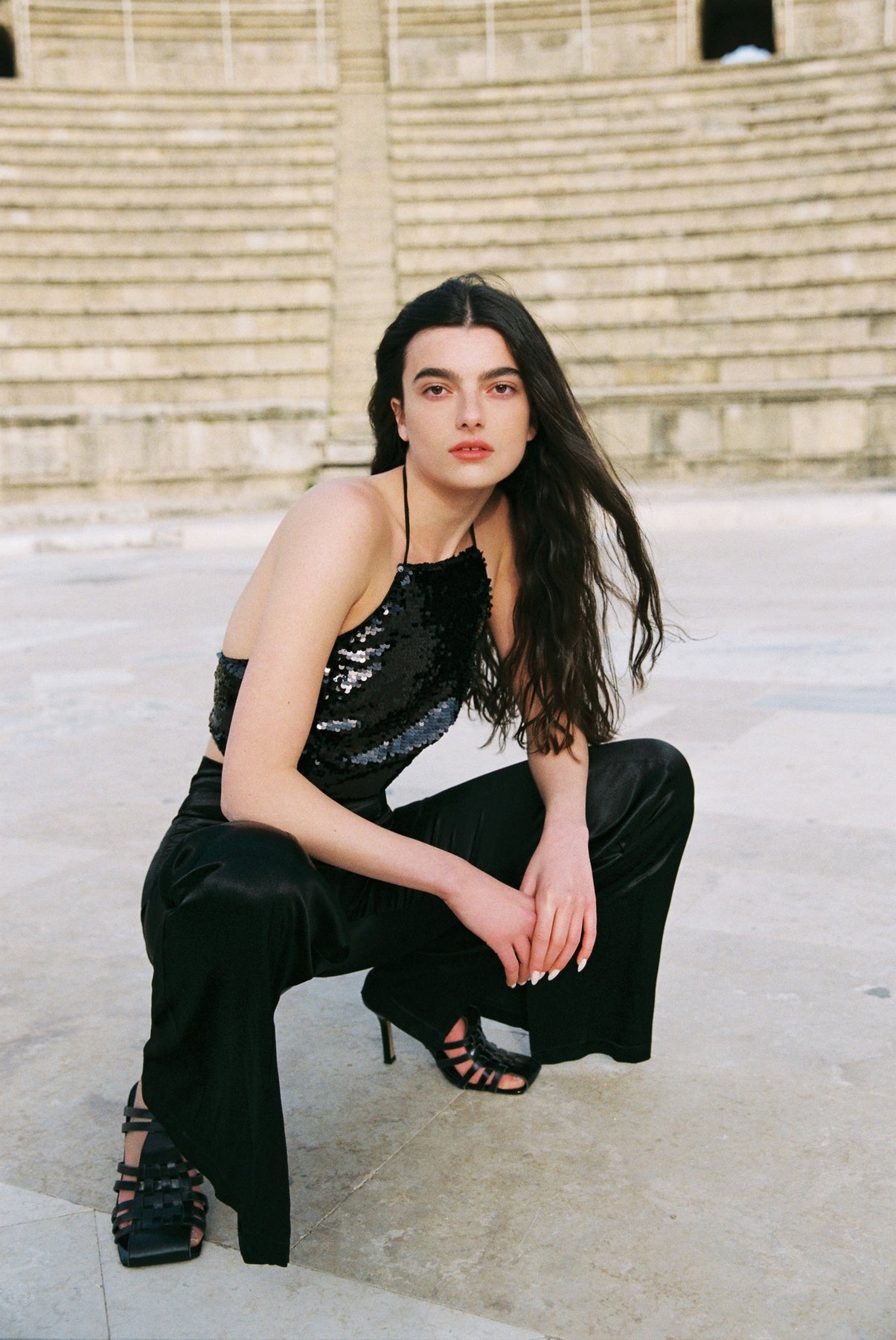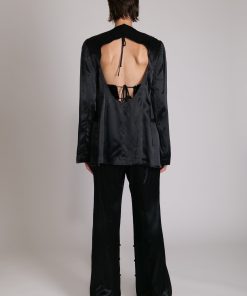 High-waist satin flared trousers with side vents and satin covered buttons, zip fly and matching covered button fastening.
