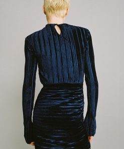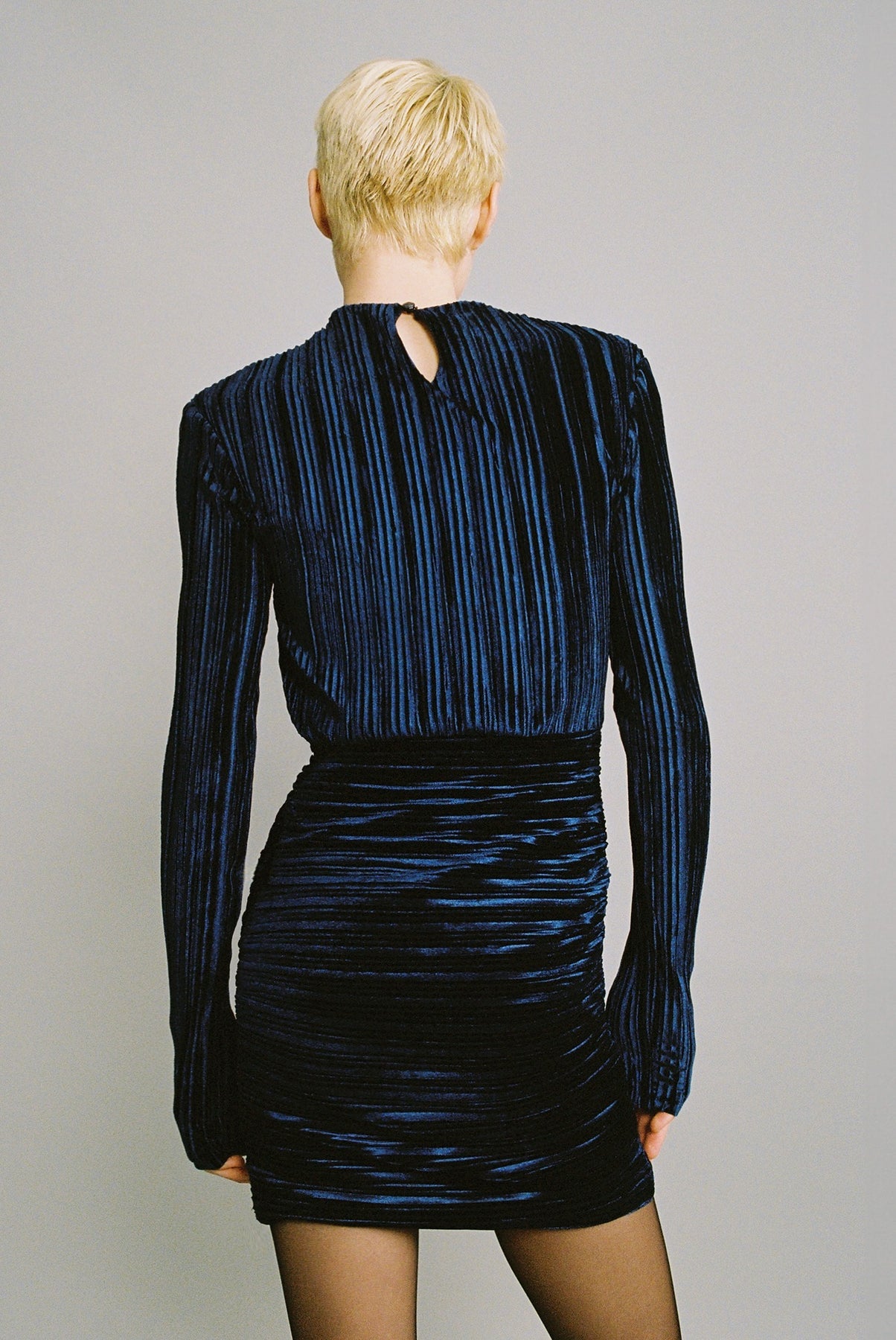 Pleated velvet mini dress with wrap gathered detail on the front.