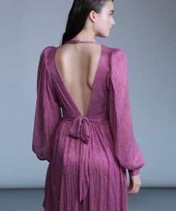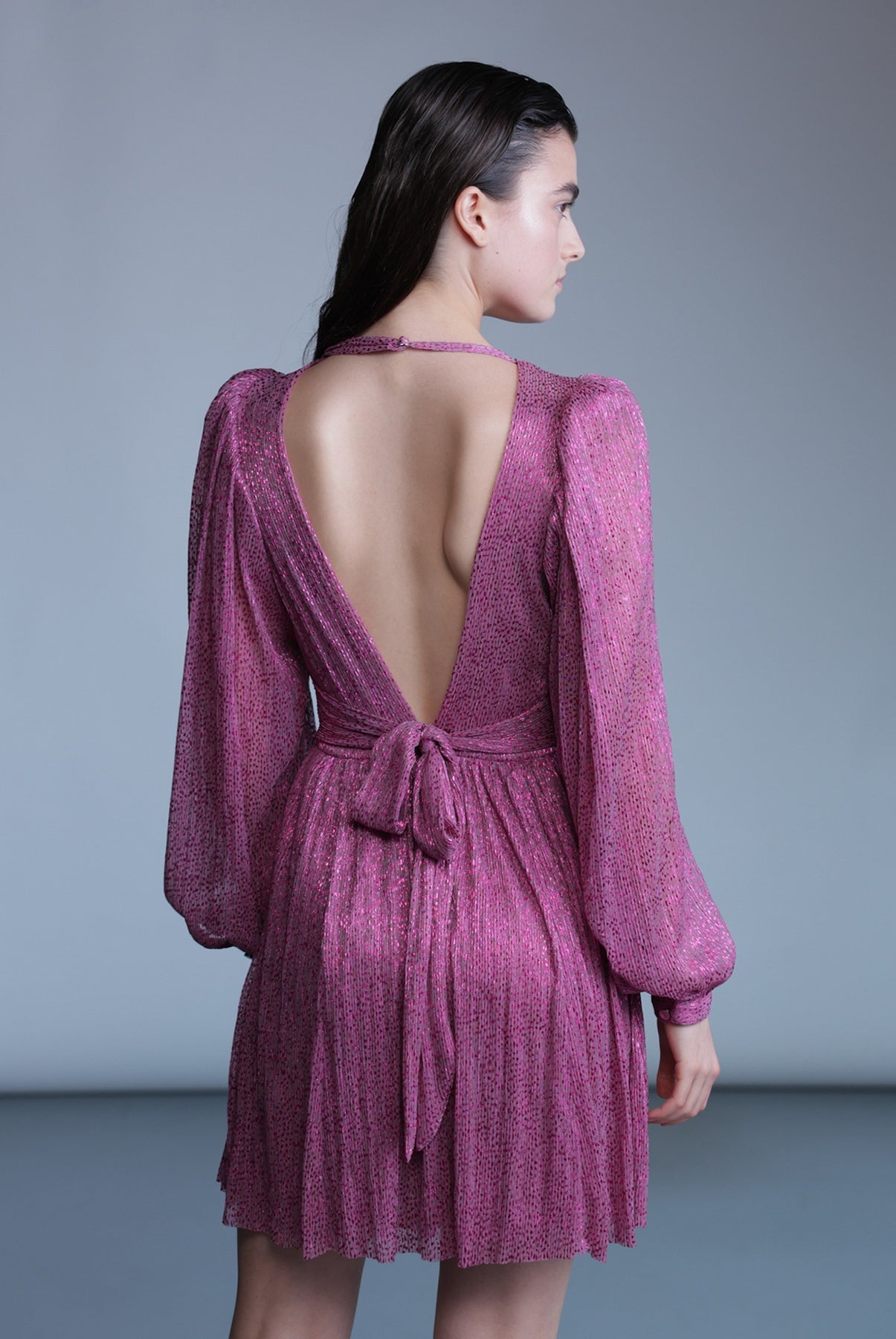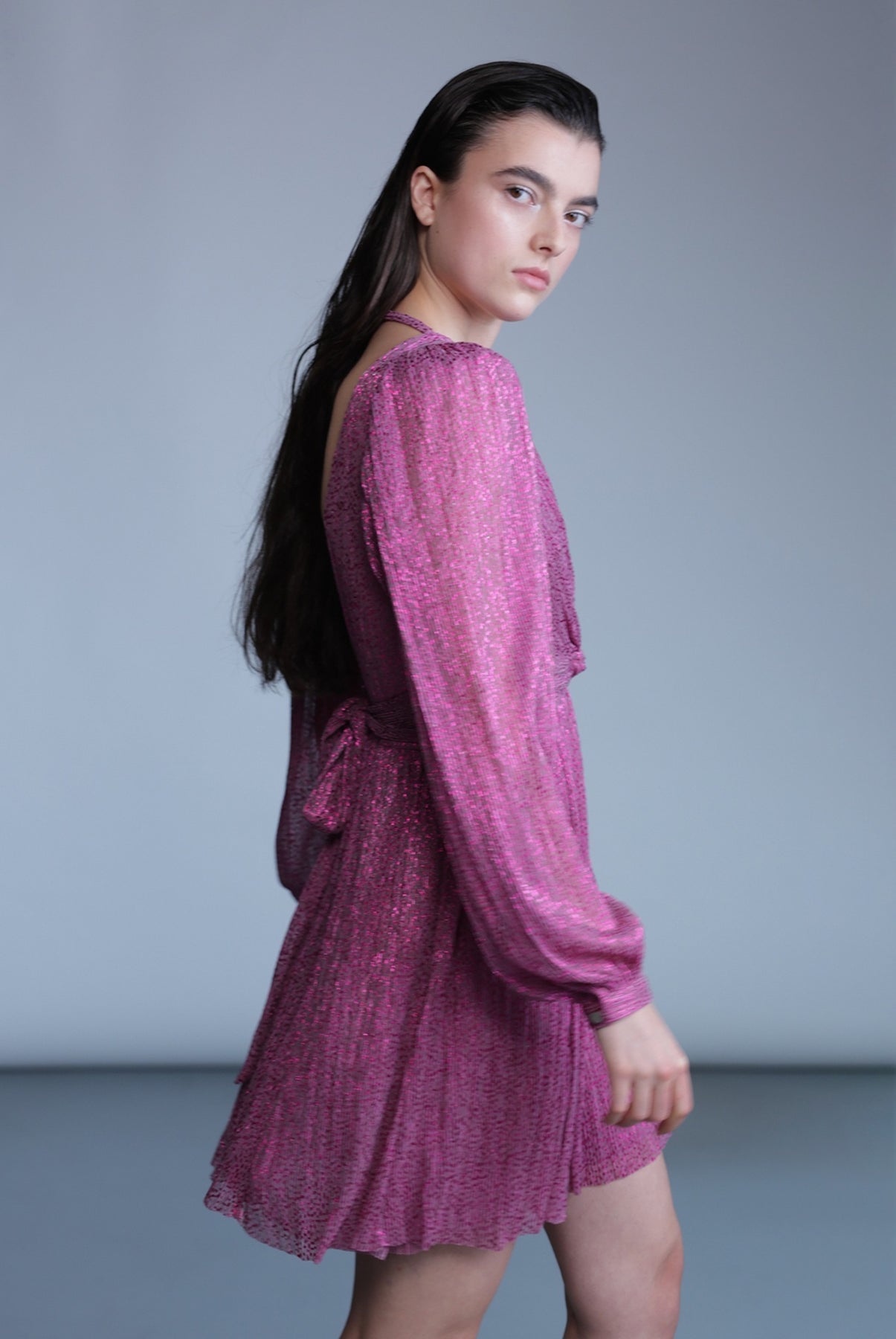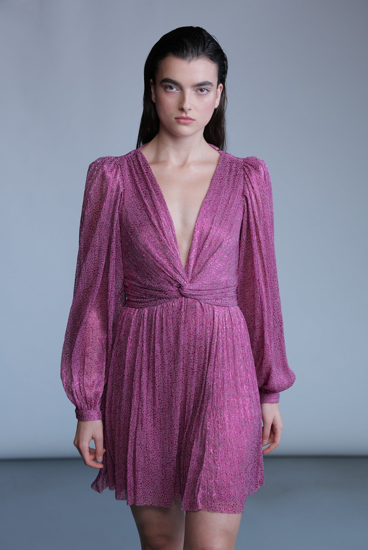Ray lurex with foil mini dress featuring a V – neckline with twist front knot detail, attached tie at back in matching fabric, and long sleeves with a cuff.