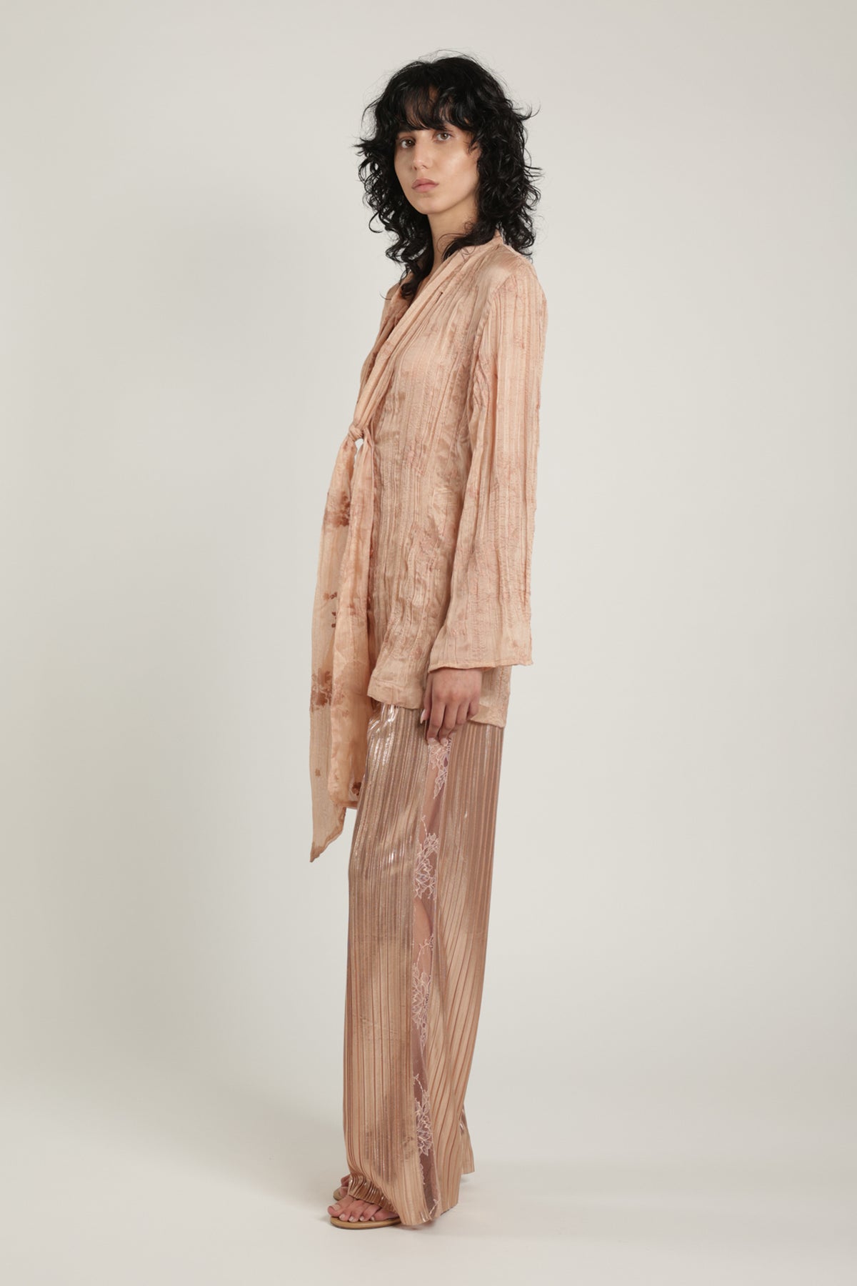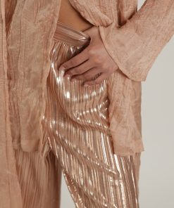 Foil pleated knit high-waist straight leg pants, elastic waist at back with invisible zipper.