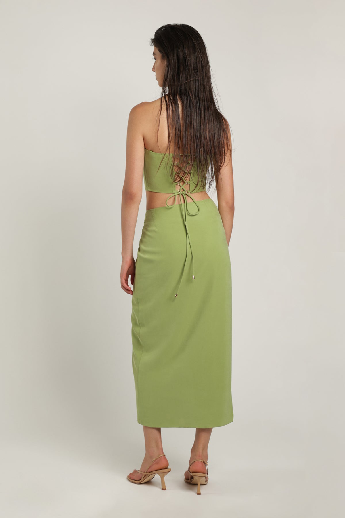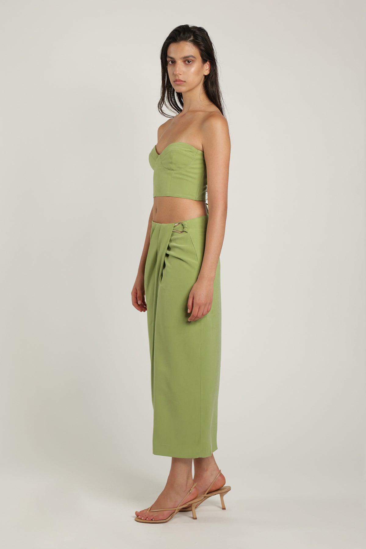 Diagonal viscose blend midi wrap skirt with a gathering details, front slit, and side zipper.